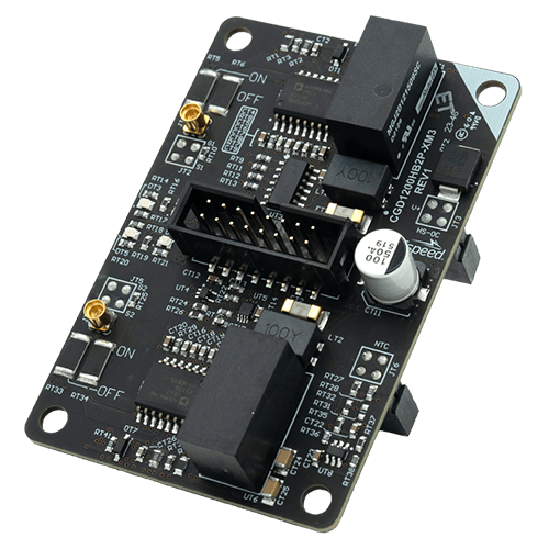 Wolfspeed’s CGD1200HB2P-XM3 is a form-factor-fitting, two-channel gate driver for the 1200 V XM3 module platform with inline gate pins. Each of the two gate drive channels features over-current protection, an active Miller clamp, and separate turn-on and turn-off gate resistors for effortlessly tuning switching speeds. Onboard 2 W isolated power supplies support up to 80 kHz switching frequency. The gate driver board features MMCX connectors to accurately measure high-side and low-side VGS with fiber optically isolated probes such as the TIVP1 from Tektronix®. The CGD1200HB2P-XM3 is an upgrade to the CGD12HBXMP gate driver by adding integrated gate measurement connections, improving the temperature feedback signaling, improving the overcurrent protection, and decreasing the soft-shutdown resistance for faster turn-off during faults.